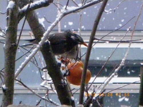 もう四月だというのに。 雪が降る。 エサを求めて、鳥たちも来る。 椋鳥(ムクドリ) 嘴が黄色い。 鵯(ヒヨドリ) 嘴が灰色。 そして、何もいなくなった。 ...今日もキャベツ料理。 春キャベツとホタテの温サラダ。 ペンネ コキーユソース カラマロのソテー…